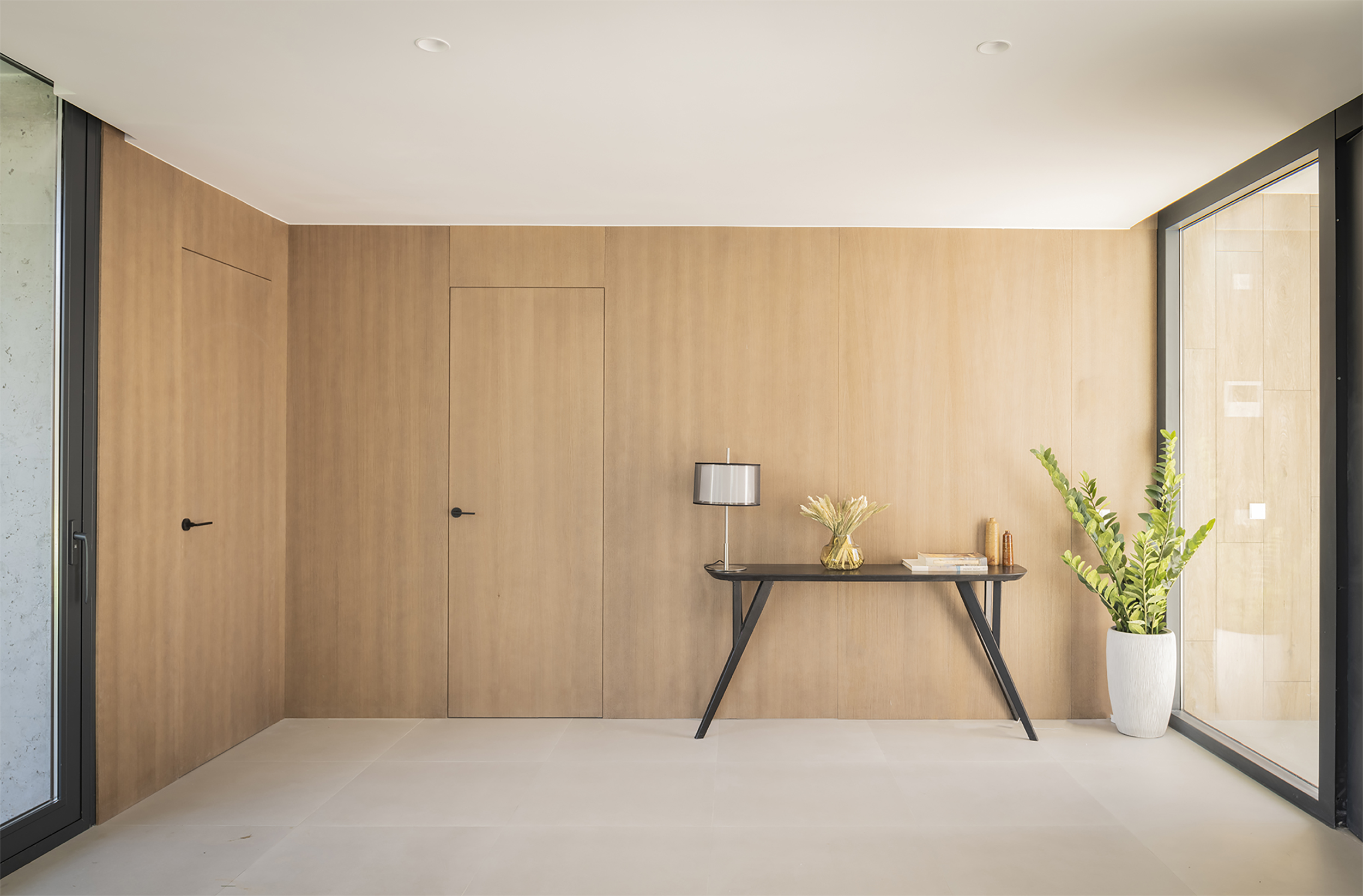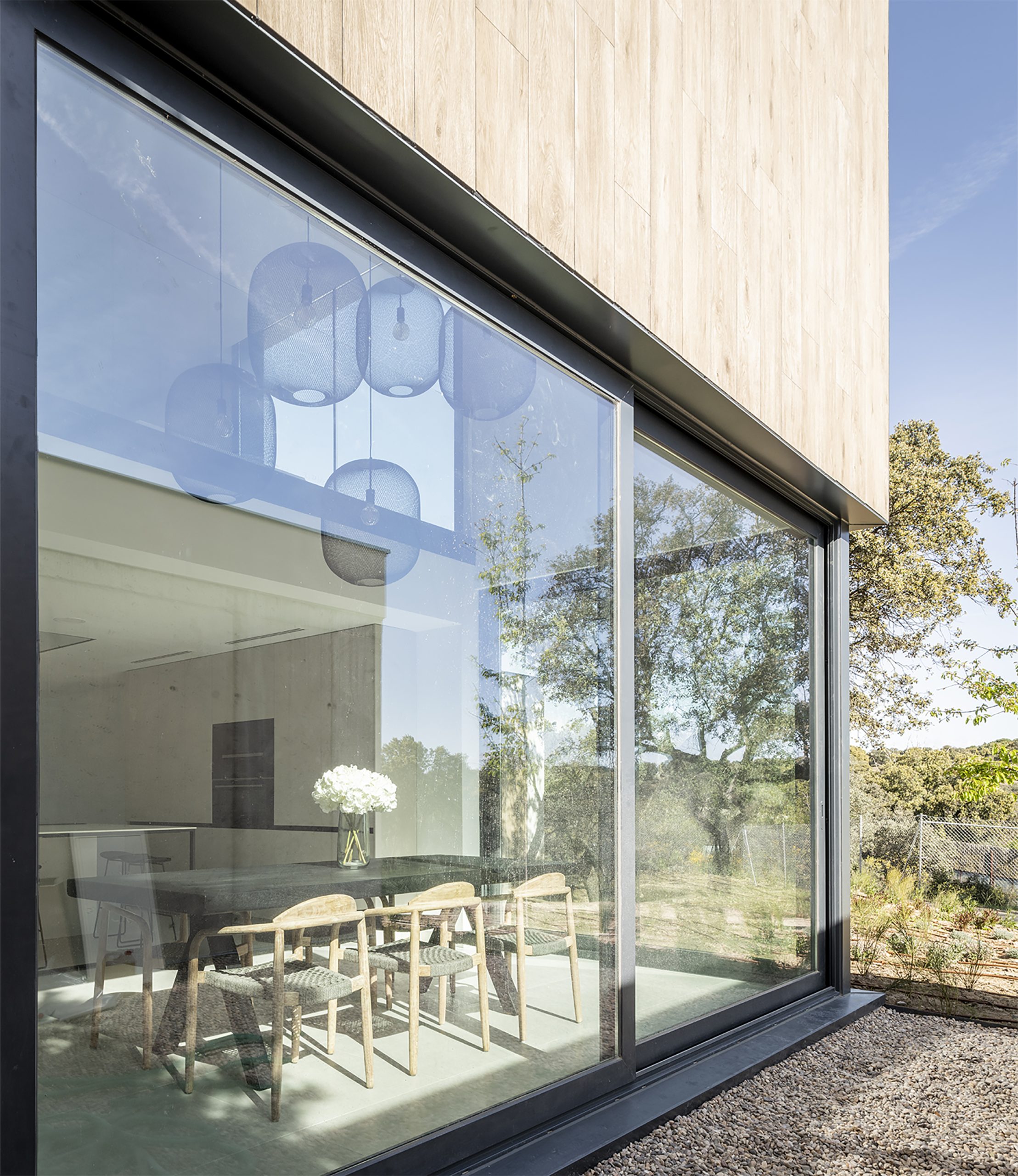 Construcción de nueva vivienda unifamiliar de 750 m2 en Villanueva de la Cañada. Distribución en dos alturas interconectadas con grandes ventanales al exterior y protección solar mediante lamas decorativas.
